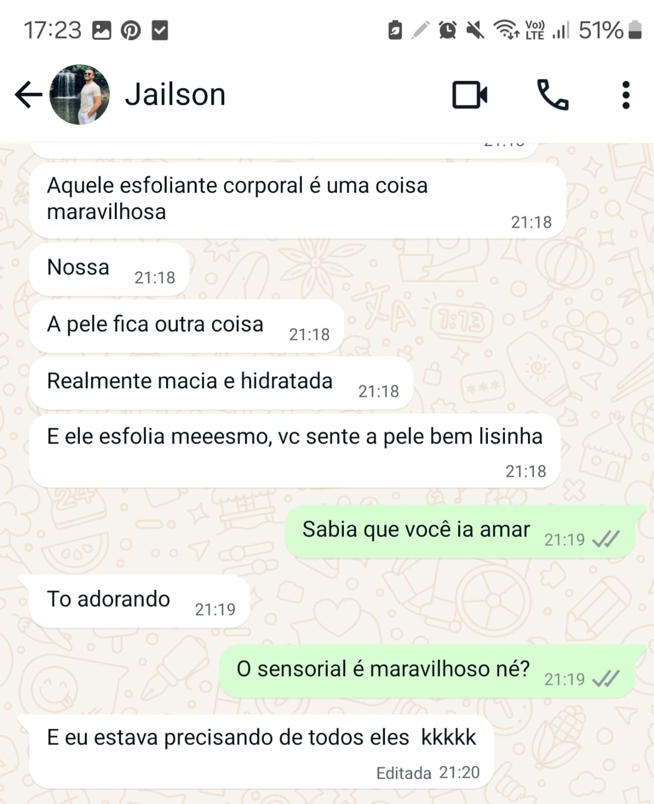 O Jailson adorou os produtos da linha skincare e corporal, especialmente o esfoliante corporal: